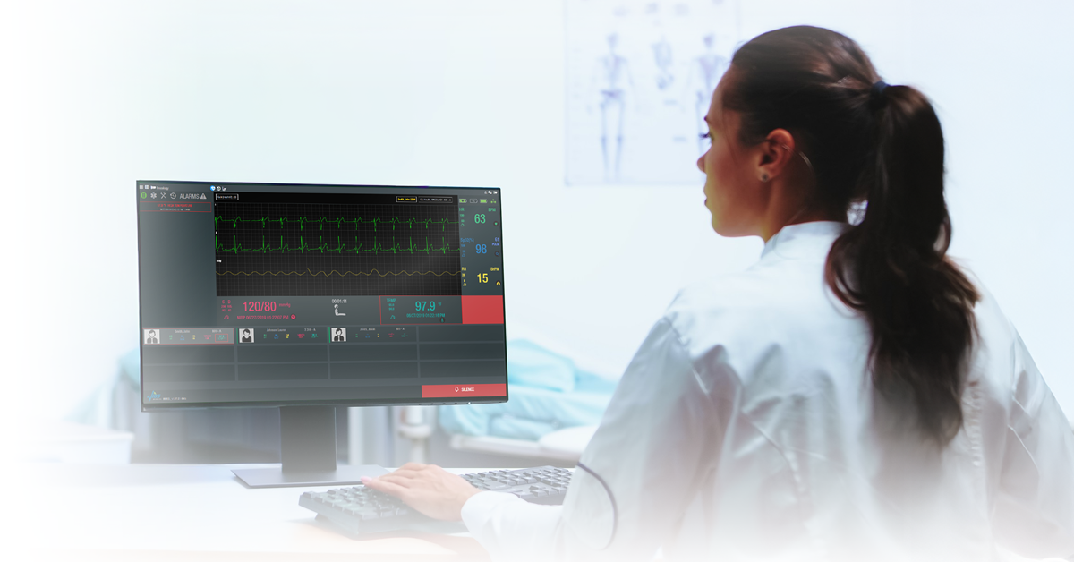 Hospital-grade cardiac telemetry and continuous vital signs monitoring for real-time data access at the bedside and via a central station.